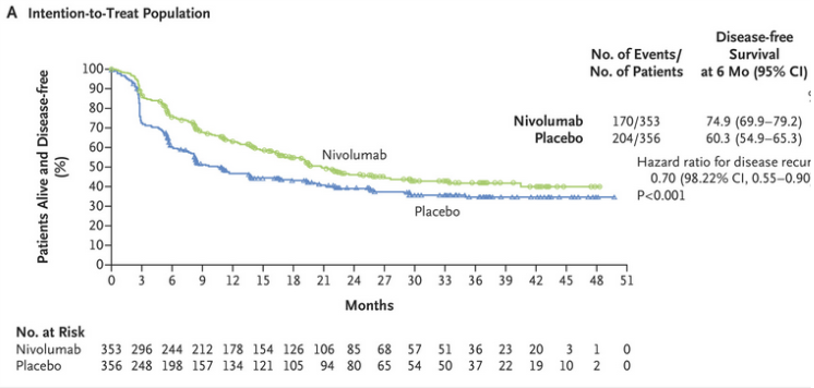 En pacientes con carcinoma urotelial músculo invasivo de alto riesgo sometidos a cirugía radical, la supervivencia libre de enfermedad fue mayor con nivolumab adyuvante que con placebo. No se observó diferencia en la mortalidad total. New England Journal of Medicine, 3 de junio de 2021.