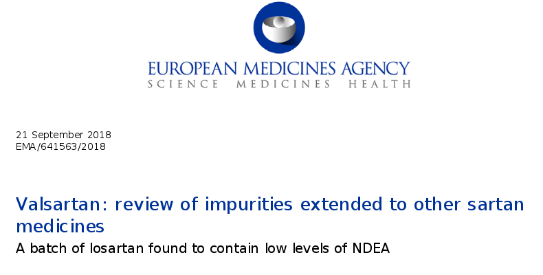EMA , 20 de septiembre de 2018 La Agencia Europea de Medicamentos (EMA) está ampliando su informe de impurezas en valsartán tras la detección de niveles muy bajos de N-nitrosodietilamina (NDEA) en otra sustancia activa, losartán, hecho por Hetero Labs en India. Como resultado de la detección de esta impureza por parte de las autoridades alemanas, la revisión ahora incluirá medicamentos que contienen otros cuatro "sartanes", a saber, candesartán, irbesartán, losartán y olmesartán.
