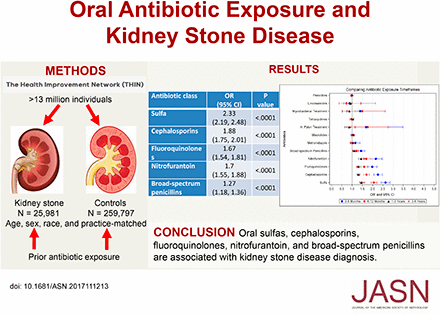 JASN, 10 de mayo de 2018 Este estudio de casos y controles e sugiere que el uso de cinco clases de antibióticos: sulfas, fluoroquinolonas, cefalosporinas, nitrofurantoína / metenamina y penicilinas de amplio espectro se asocia con un mayor riesgo de nefrolitiasis, en comparación con el no uso. Los niños tuvieron el mayor aumento en el riesgo. En un análisis de diferentes ventanas de tiempo de exposición a antibióticos, el riesgo se mantuvo elevado durante 3 a 5 años después de la exposición para todas las penicilinas, excepto las de amplio espectro. Los autores especulan que la alteración inducida por antibióticos del microbioma intestinal podría cambiar el metabolismo de macronutrientes, lo que lleva a cálculos renales. Señalan que no pudieron excluir la cristalización antibiótica directa en el riñón.