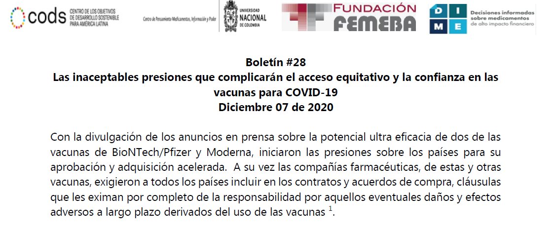 Con la divulgación de los anuncios en prensa sobre la potencial ultra eficacia de dos de las vacunas de BioNTech/Pfizer y Moderna, iniciaron las presiones sobre los países para su aprobación y adquisición acelerada. A su vez las compañías farmacéuticas, de estas y otras vacunas, exigieron a todos los países incluir en los contratos y acuerdos de compra, cláusulas que les eximan por completo de la responsabilidad por aquellos eventuales daños y efectos adversos a largo plazo derivados del uso de las vacunasLos acuerdos para garantizar el acceso a vacunas deberían darse en el marco de los principios básicos de la bioética y apostar por condiciones de absoluta transparencia.Las cláusulas son una opción, no una obligación. DIME, boletín #28 , 7 de diciembre de 2020