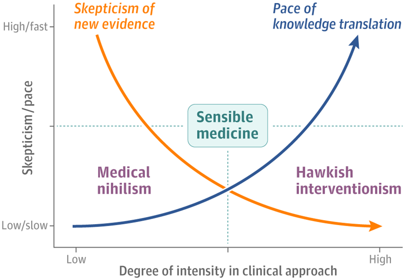 Este punto de vista propone que la medicina sensata para COVID-19 puede servir mejor a los pacientes que un tratamiento sin razón que utiliza intervenciones no probadas hasta el momento. Con la medicina sensata, la traducción del conocimiento a la cabecera de la cama se calibra adecuadamente con el rigor y el razonamiento de la evidencia disponible y la gravedad del resultado que se debe evitar. JAMA. 15 de octubre de 2020