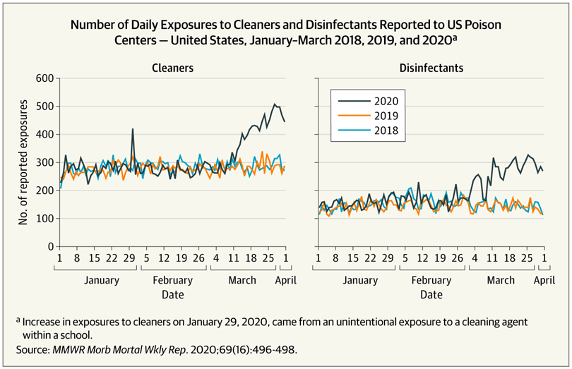 El fuerte aumento en las llamadas sobre exposiciones a esos productos comenzó en marzo de 2020, según muestran los datos del equipo de vigilancia de los CDC. JAMA, 9 de junio de 2020
