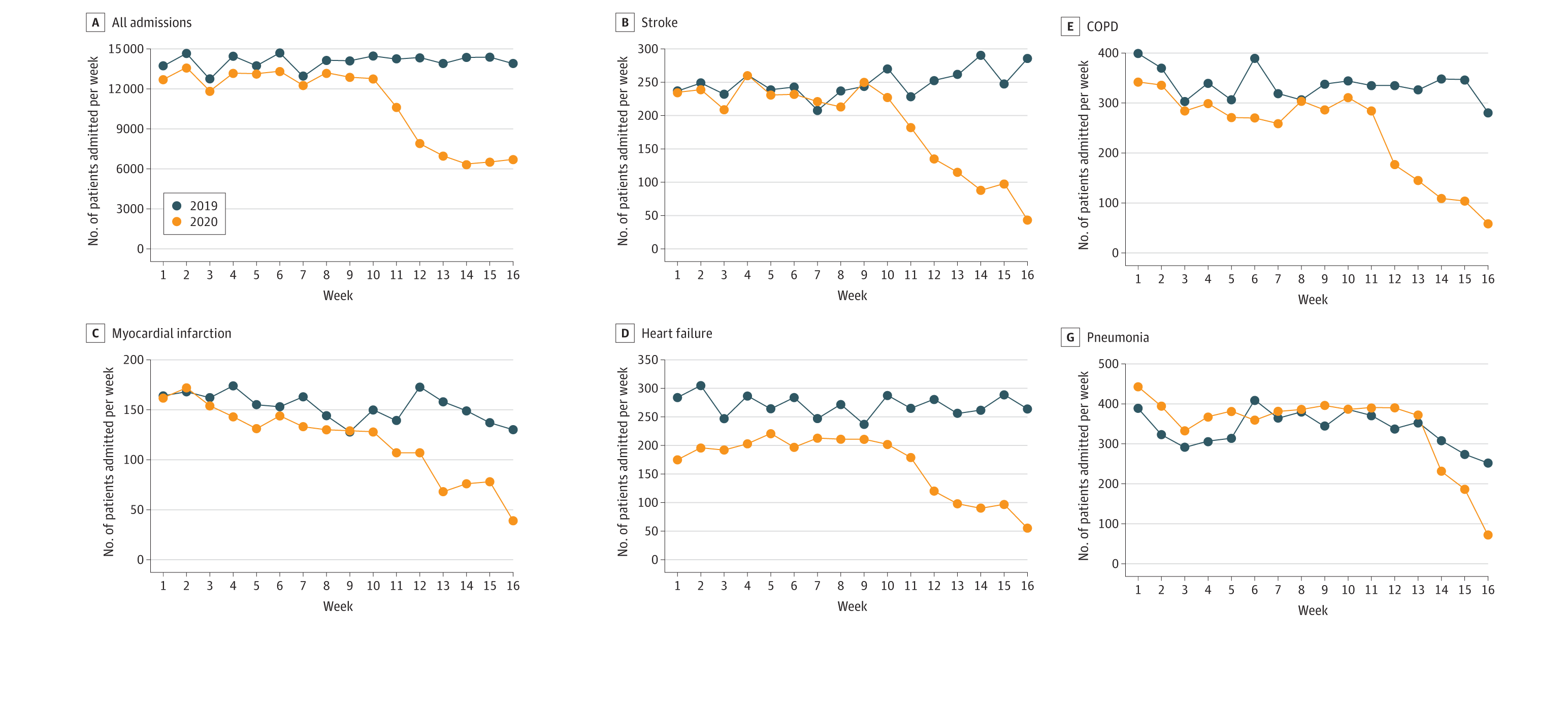 Un descenso de más del 40% en las internaciones por accidente cerebrovascular, insuficiencia cardíaca, infarto de miocardio y EPOC hace temer por las consecuencias de dejar desatendidas otras enfermedades graves durante la atención de la COVID-19. JAMA, 5 de junio de 2020.