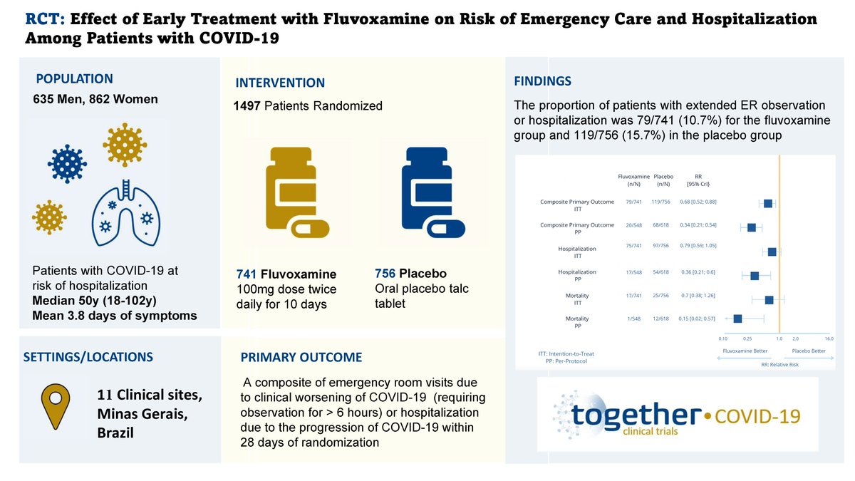 El tratamiento con fluvoxamina (100 mg dos veces al día durante 10 días) entre pacientes ambulatorios de alto riesgo con diagnóstico temprano de COVID-19 redujo la necesidad de hospitalización definida como retención en un entorno de emergencia de COVID-19 o derivación a un hospital terciario. Lancet Glob Health. 27 de octubre de 2021