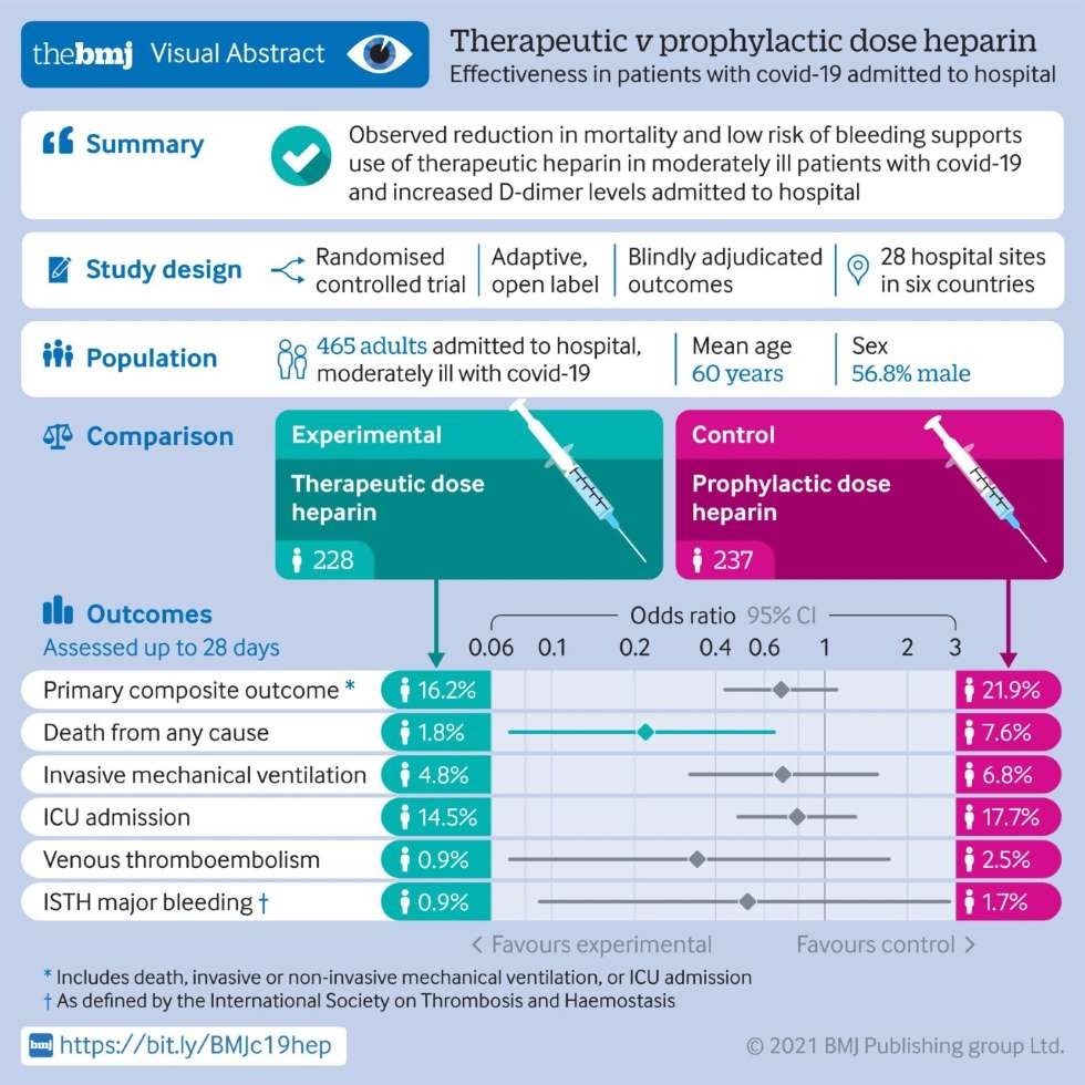 En pacientes moderadamente enfermos con covid-19 y niveles elevados de dímero D ingresados en salas de hospital, la heparina terapéutica no se asoció significativamente con una reducción en el resultado primario, pero las probabilidades de muerte a los 28 días sí disminuyeron. El riesgo de hemorragia grave pareció bajo en este ensayo. BMJ, 14 de octubre de 2021