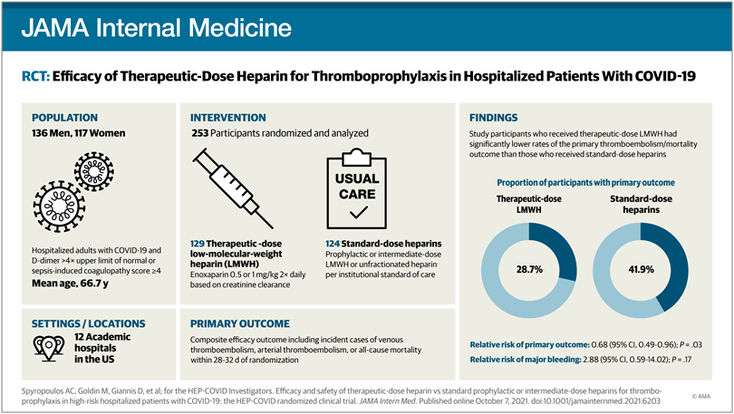 En este ensayo clínico aleatorizado, la heparina de bajo peso molecular (HBPM) en dosis terapéuticas redujo la tromboembolia mayor y la muerte en comparación con la tromboprofilaxis estándar institucional con heparina entre los pacientes hospitalizados con COVID-19 con niveles muy elevados de dímero-D. El efecto del tratamiento no se observó en los pacientes de la UCI. JAMA Internal Medicine, 7 de octubre de 2021