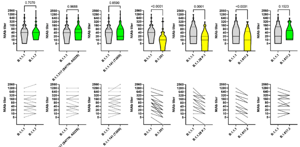 Para el B.1.351, P.1 y B.1.617.2, se observó una reducción de VNA estadísticamente significativo 3,1, 2,8 y 2,5 veces, respectivamente. Cabe destacar que esta disminución es menor que la reportada en publicaciones para otras vacunas. Sin embargo, es necesario un estudio comparativo directo para llegar a una conclusión. Vaccines, 12 de julio de 2021