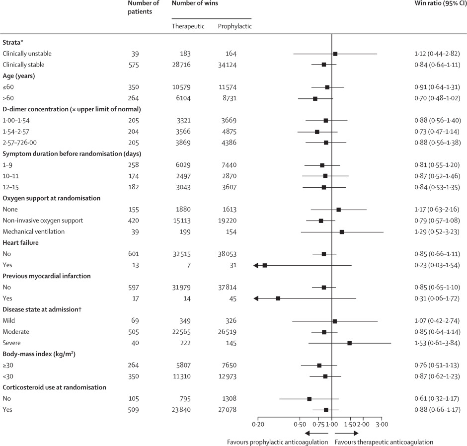 En pacientes hospitalizados con COVID-19 y dímero D elevado, la anticoagulación terapéutica intrahospitalaria con rivaroxabán o enoxaparina seguida de rivaroxabán hasta el día 30 no mejora los resultados clínicos y aumenta el sangrado en comparación con la anticoagulación profiláctica.Lancet, 4 de junio de 2021
