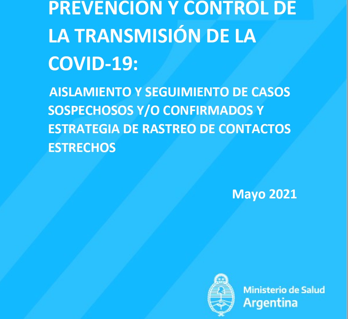 Esta publicación contiene una sección con recomendaciones para realizar el aislamiento y el seguimiento de personas con sospecha y/o confirmación de la enfermedad, actividad central para brindar un cuidado adecuado y reducir así las complicaciones y fallecimientos. En la segunda sección se presentan orientaciones para prevenir y contener el incremento de casos por COVID-19, focalizando en el rastreo de contactos estrechos. Se incorporan a esta guía consideraciones sobre dicha actividad en la situación epidemiológica de “transmisión alta” y una actualización de las definiciones de contacto estrecho y cuarentena. Ministerio de Salud, mayo 2021