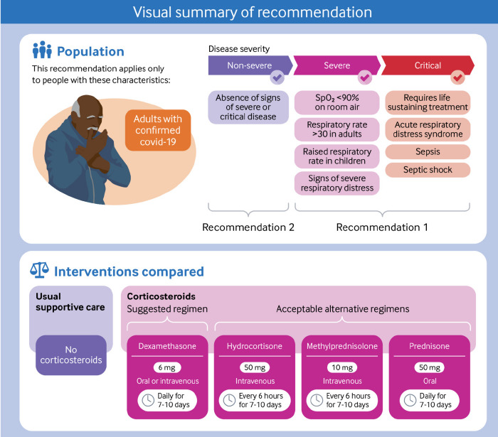El panel hizo una fuerte recomendación para el uso de corticosteroides en el covid-19 grave y crítico porque existe un menor riesgo de muerte entre las personas tratadas con corticosteroides sistémicos (evidencia de certeza moderada), y creen que todos o casi todos los pacientes están plenamente informados con covid-19 grave y crítico elegirían este tratamiento. Por el contrario, el panel concluyó que los pacientes con covid-19 no grave rechazarían este tratamiento porque es poco probable que se beneficien y puedan resultar perjudicados. Además, teniendo en cuenta tanto la salud pública como la perspectiva del paciente, el panel advirtió que el uso indiscriminado de cualquier terapia para el covid-19 podría agotar rápidamente los recursos globales y privar a los pacientes que pueden beneficiarse más de ella como una terapia que potencialmente salva vidas. BMJ 4 de septiembre de 2020