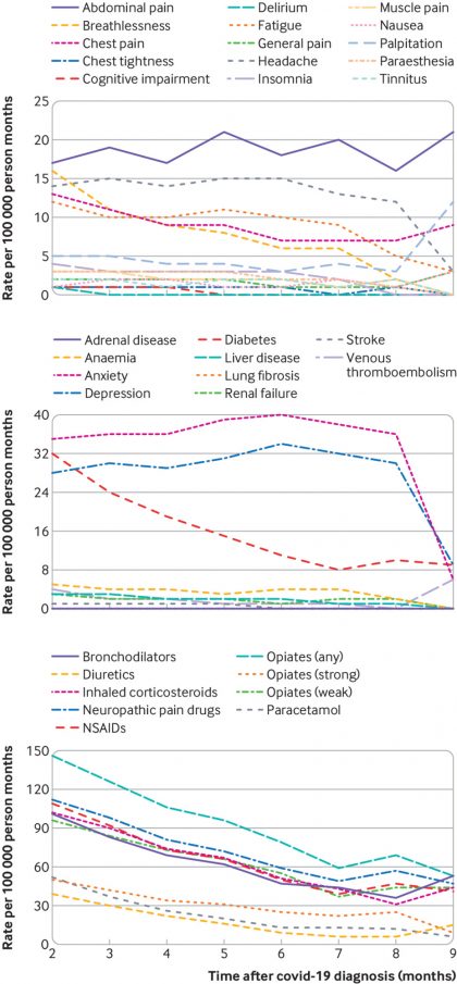 Las tasas de consulta con el médico de cabecera por secuelas después de una infección aguda por covid-19 difirieron entre los pacientes con covid-19 que ingresaron en el hospital y los tratados en la comunidad. Para los individuos de la comunidad, las tasas de algunas secuelas disminuyeron con el tiempo, pero persistieron las de otras, como la ansiedad y la depresión. Las tasas de algunos resultados disminuyeron después de la vacunación en este grupo. BMJ, 29 de diciembre de 2021