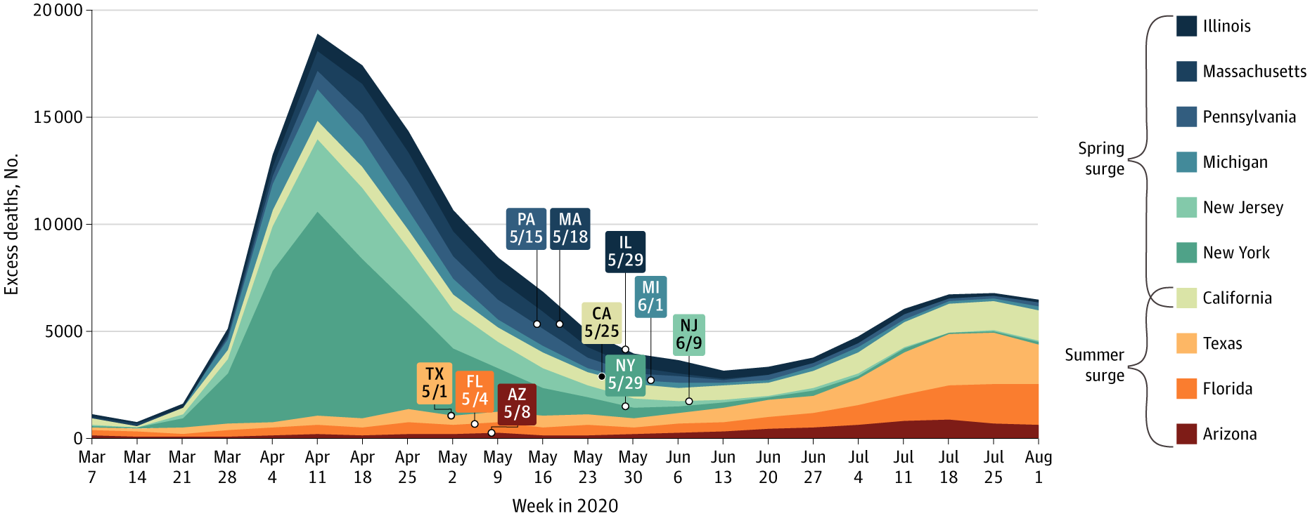 Entre marzo y julio de 2020 las defunciones totales en EEUU aumentaron un 20% sobre las esperadas, de las cuales dos tercios se atribuyeron a COVID-19 y el resto a un aumento de mortalidad por otras enfermedades, atribuible a los trastornos sanitarios ocasionados por la pandemia. JAMA, 12 de octubre de 2020.