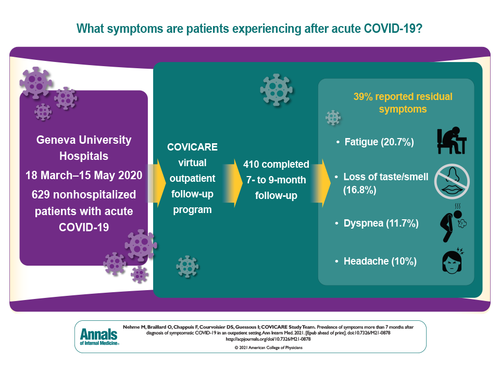 Los síntomas residuales después de la infección por SARS-CoV-2 son comunes entre personas por lo demás jóvenes y sanas seguidas en un entorno ambulatorio. Estos hallazgos contribuyen al reconocimiento de los efectos a largo plazo en una enfermedad contabilizada hasta la fecha principalmente por su número de muertes, al promover la comunicación sobre las secuelas post agudas del SARS-CoV-2 y alentar a los médicos a continuar con el monitoreo a largo plazo de sus pacientes. Ann Intern Med, 6 de julio de 2021 .