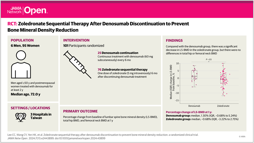 En este ensayo aleatorizado de tratamiento secuencial tras la interrupción de denosumab, se observó pérdida ósea en la densidad mineral ósea en la columna lumbar (DMO-LS) en el primer año de tratamiento con zoledronato. Una mayor duración del tratamiento con denosumab se asoció con una disminución adicional de la DMO-LS-después del tratamiento secuencial con zoledronato. Se necesitan ensayos clínicos aleatorizados adicionales y estudios a gran escala que investiguen las estrategias de tratamiento secuencial después del tratamiento a largo plazo con denosumab. JAMA Netw Open. 11 de noviembre de 2024