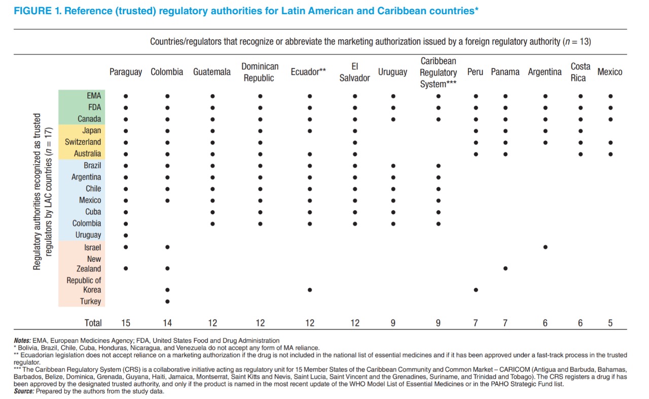 La utilización de las decisiones de autoridades regulatorias de otras jurisdicciones se han convertido en una práctica común en América Latina y el Caribe. Trece de veinte autoridades regulatorias reconocen directamente o abrevian el proceso de aprobación de nuevos medicamentos en caso de que hayan recibido previamente la aprobación por parte de un organismo regulatorio de otra jurisdicción. La Agencia Europea de Medicamentos, la Administración de Alimentos y Medicamentos de Estados Unidos y Salud Canadá son las autoridades regulatorias de otras jurisdicciones en las cuales los reguladores de América Latina y el Caribe confían más. Rev Panam Salud Publica, 9 de abril de 2021