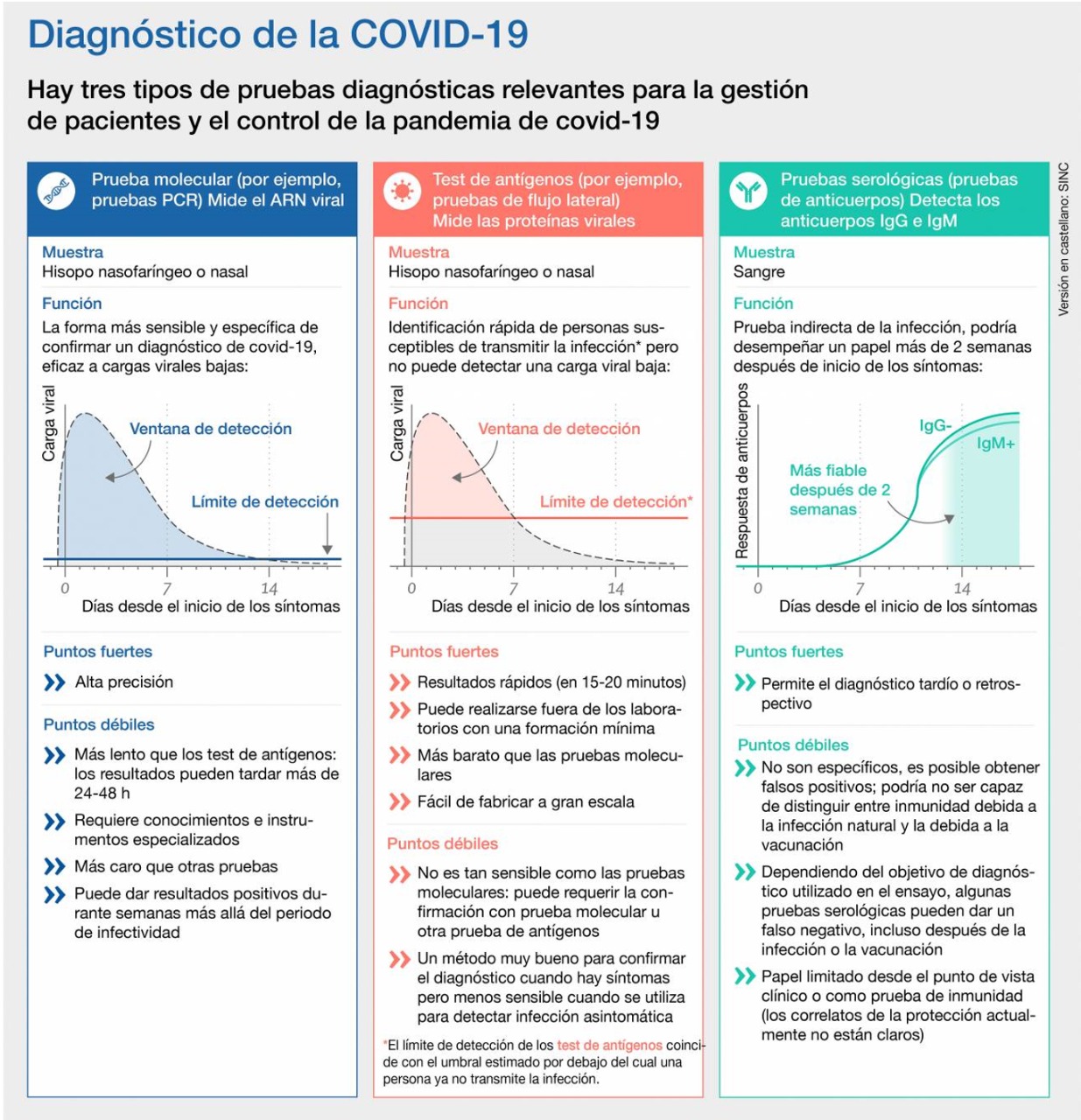 Los diagnósticos han demostrado ser cruciales para la respuesta a la pandemia de COVID-19. Hay tres métodos principales para la detección de la infección por SARS-CoV-2 y su función ha evolucionado durante el curso de la pandemia. Lancet, 20 de diciembre de 2021