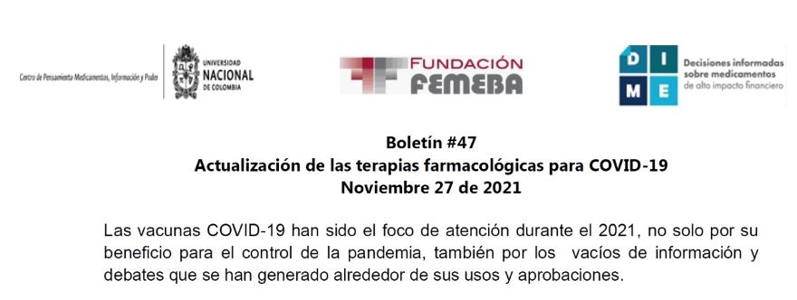 El presente boletín es una actualización de aquellas terapias farmacológicas que durante los últimos meses han publicado resultados prometedores. Estas terapias farmacológicas corresponden a dos grandes grupos: los anticuerpos monoclonales y nuevos antivirales. Boletín DIME #47, 27 de noviembre de 2021