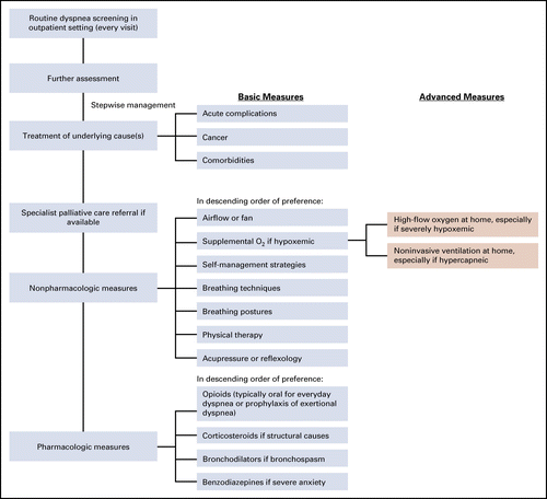 Se recomienda un enfoque jerárquico para el manejo de la disnea, comenzando con la evaluación de la disnea, la determinación y el manejo de causas potencialmente reversibles y la derivación a un equipo de cuidados paliativos interdisciplinario. Las intervenciones no farmacológicas que se pueden ofrecer para aliviar la disnea incluyen intervenciones de flujo de aire (p. Ej., Un abanico dirigido a la mejilla), oxígeno suplementario estándar para pacientes con hipoxemia y otros enfoques psicoeducativos, de autocuidado o complementarios. Para los pacientes que obtienen un alivio inadecuado de las intervenciones no farmacológicas, se deben ofrecer opioides sistémicos. También se comentan otras intervenciones farmacológicas, como los corticosteroides y las benzodiazepinas. Journal of Clinical Oncology , 22 de febrero de 2021.