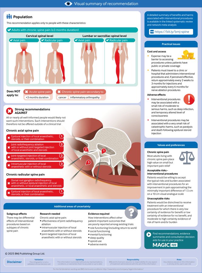 Estas recomendaciones se aplican a las personas que viven con dolor de columna crónico (≥3 meses de duración) que no está asociado con cáncer o artropatía inflamatoria y no se aplican al tratamiento del dolor de columna agudo. Se justifica la realización de más investigaciones que puedan modificar las recomendaciones en el futuro: en particular, si existen diferencias en los efectos del tratamiento en función de los subtipos de dolor de columna crónico, el establecimiento de la eficacia de los procedimientos intervencionistas actualmente respaldados por evidencia de certeza baja o muy baja, y los efectos sobre los resultados importantes para el paciente que no se informan adecuadamente (como el uso de opioides, el regreso al trabajo y la calidad del sueño). BMJ, 19 de febrero de 2025
