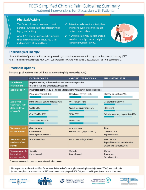 Esta guía para el tratamiento del dolor crónico, incluida la osteoartritis, el dolor lumbar y el dolor neuropático, destaca la mejor evidencia disponible que incluye beneficios y daños para una serie de intervenciones de tratamiento. Se hace una fuerte recomendación para el ejercicio como tratamiento primario para la osteoartritis crónica y el dolor lumbar en base a evidencia demostrada de beneficio a largo plazo. Esta información está destinada a ayudar, no dictar, la toma de decisiones compartida con los pacientes. Canadian Family Physician March, 6 de marzo de 2022