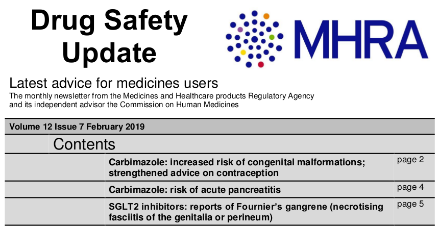 MHRA, 18 de febrero de 2019 Carbimazol: mayor riesgo de malformaciones congénitas y pancreatitis Inhibidores de SGLT2: informes de gangrena de Fournier