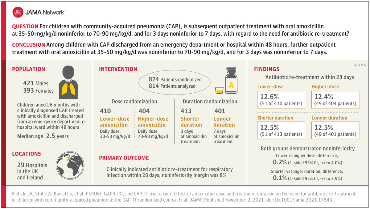 Entre los niños con neumonía adquirida en la comunidad dados de alta de un departamento de emergencias, una unidad de observación o una sala de hospitalización, el tratamiento ambulatorio adicional con amoxicilina oral a una dosis de 35 a 50 mg / kg por día no fue inferior a una dosis de 70 a 90 mg / kg por día y 3 días no fue inferior a 7 días con respecto a la necesidad de un retratamiento antibiótico posterior. JAMA, 2 de noviembre de 2021
