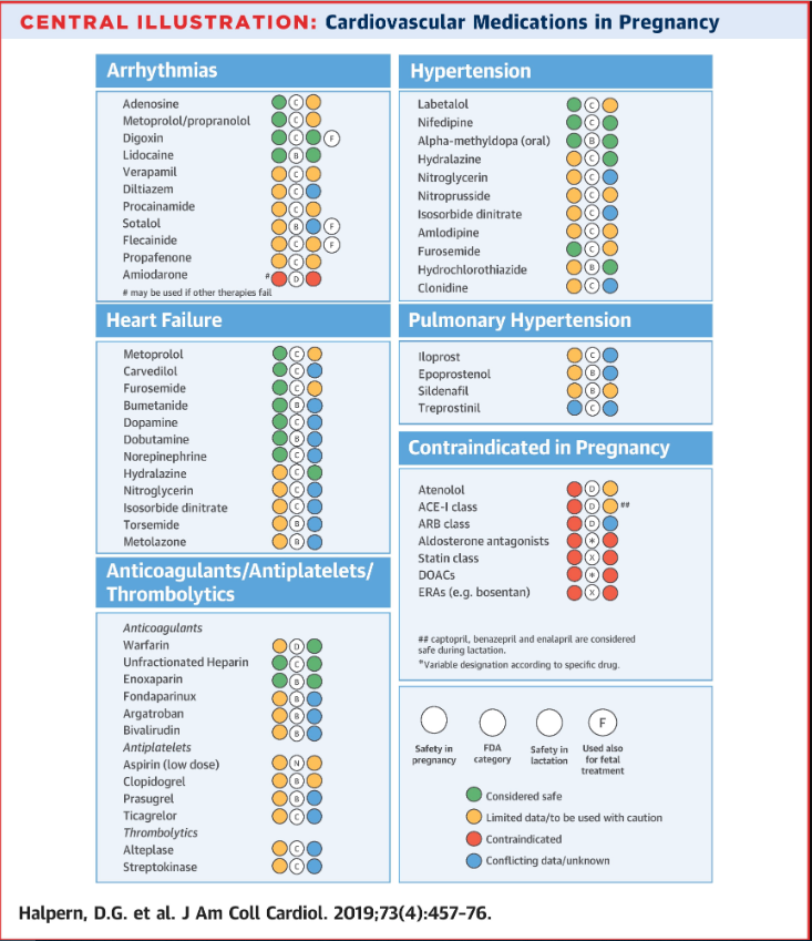 J Am Coll Cardiol, 5 de febrero de 2019 Esta revisión resume los datos publicados, las pautas disponibles y las recomendaciones para el uso de medicamentos cardiovasculares durante el embarazo.