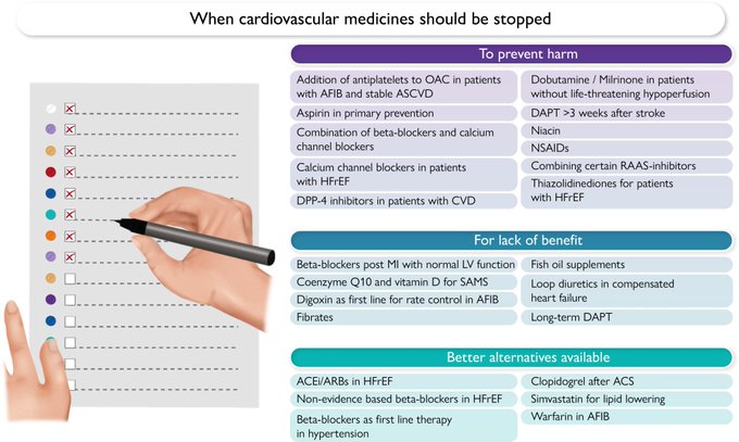 En este trabajo se discuten varios medicamentos cardiovasculares o clases de medicamentos que, en opinión de este autor, el grupo debería suspenderse en general, ya sea por la prevención de daños potenciales, por falta de beneficio o por la disponibilidad de mejores alternativas. European Heart Journal, 5 de junio de 2024