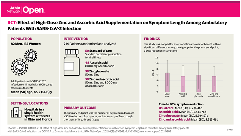 Efecto de la suplementación de zinc y vitamina C en dosis altas frente a la atención habitual sobre la duración y la reducción de los síntomas en pacientes ambulatorios con infección por SARS-CoV-2