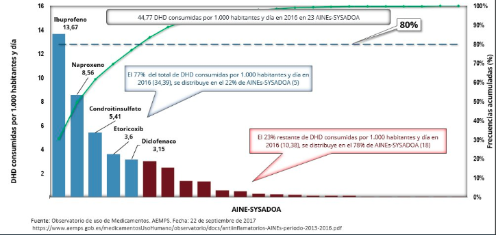 AEMPS, 22 de septiembre de 2017 De 2013 a 2016 se observó una disminución del consumo del 12,13%, en todos los subgrupos. Durante 2016, 5 principios activos registran 80% del consumo, contabilizando Ibuprofeno y naproxeno el 50%. siendo este último el único que registra una aumento de sus uso