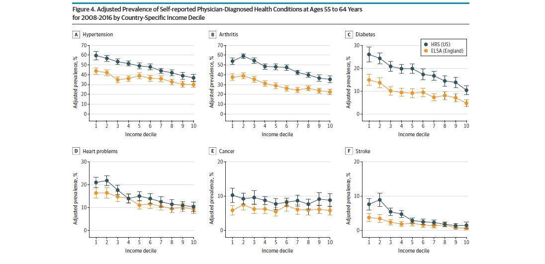 En una comparación entre cohortes de ambos países, la menor dispersión del ingreso en Inglaterra se asocia con menores diferencias en los resultados de salud dentro del país, y también en mejores resultados que en EEUU, especialmente en la población de menores ingresos. JAMA Internal Medicine, 13 de julio de 2020