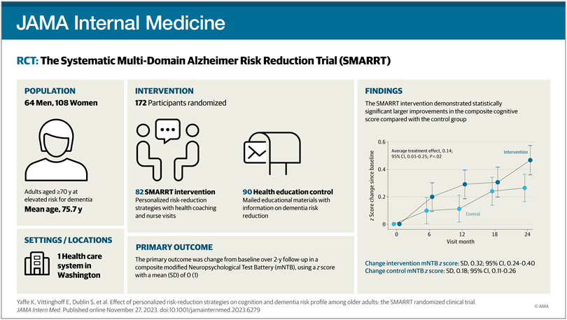 En este ensayo clínico aleatorizado, una intervención multidominio personalizada de 2 años condujo a mejoras modestas en la cognición, los factores de riesgo de demencia y la calidad de vida. Se deben considerar estrategias modificables de reducción de riesgos para los adultos mayores con riesgo de demencia. JAMA Intern Med , 27 de noviembre de 2023.