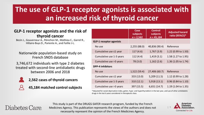 En este estudio anidado de casos y controles, encontramos un mayor riesgo de cáncer de tiroides y cáncer de tiroides medular con el uso de AR GLP-1, en particular después de 1 a 3 años de tratamiento. Los médicos deben ser conscientes de este riesgo potencial al iniciar un agonista del receptor de GLP-1 y monitorear cuidadosamente a los pacientes expuestos. Diabetes Care, 10 de noviembre de 2022