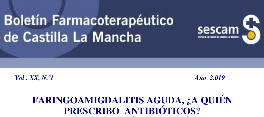 Boletín Farmacoterapéutico de Castilla La Mancha Vol . XX, N.o1 Año 2.019SESCAM, 5 de abril de 2019El consumo no prudente de antibióticos ha derivado en uno de los mayores problemas de salud a nivel mundial, la resistencia antibiótica. Una de las principales causas de prescripción innecesaria de antibióticos, tanto en adultos como en niños, es la faringoamigdalitis aguda (FAA).