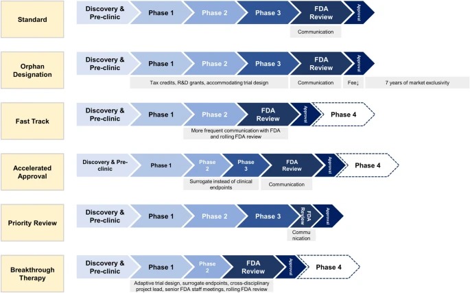 Designaciones especiales de la FDA para el desarrollo de medicamentos: huérfano, vía rápida, aprobación acelerada, revisión prioritaria y terapia innovadora