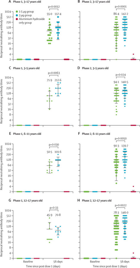 CoronaVac es bien tolerada y segura e induce respuestas humorales en niños y adolescentes de 3 a 17 años. Los títulos de anticuerpos neutralizantes inducidos por la dosis de 3,0 µg fueron más altos que los de la dosis de 1,5 µg. Los resultados apoyan el uso de una dosis de 3,0 μg con un calendario de dos inmunizaciones para estudios adicionales en niños y adolescentes. Lancet Infect Dis. 28 de junio de 2021