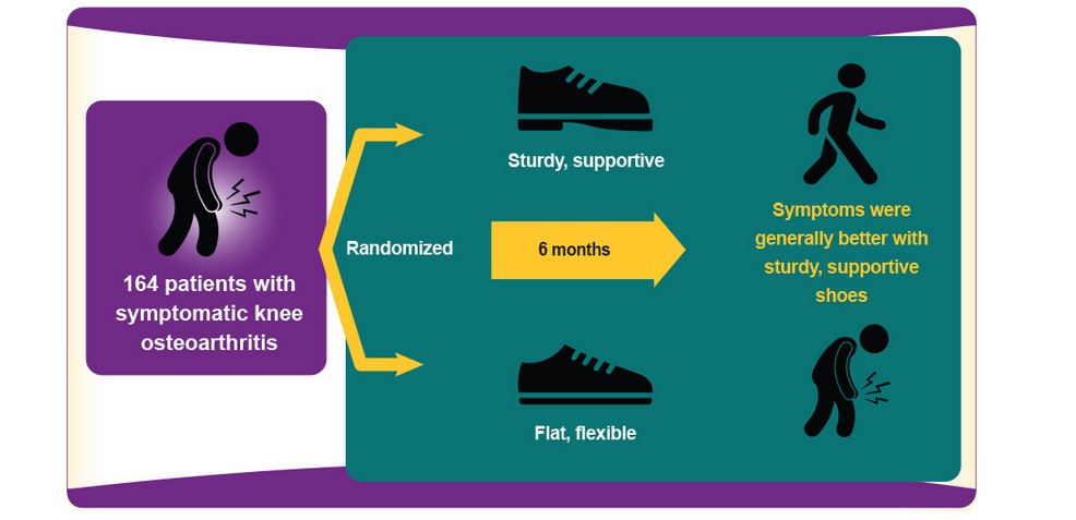 Contrariamente a la hipótesis de los investigadores, los zapatos con soporte estable mejoraron el dolor de rodilla al caminar más que los zapatos planos flexibles. Annals of Internal Medicine, 12 de enero de 2021.