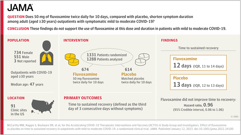 En este ensayo clínico aleatorizado, entre los pacientes ambulatorios con COVID-19 de leve a moderado, el tratamiento con 50 mg de fluvoxamina dos veces al día durante 10 días, en comparación con el placebo, no mejoró el tiempo de recuperación sostenida. Estos hallazgos no respaldan el uso de fluvoxamina a esta dosis y duración en pacientes con COVID-19 de leve a moderado. JAMA. 12 de enero de 2023