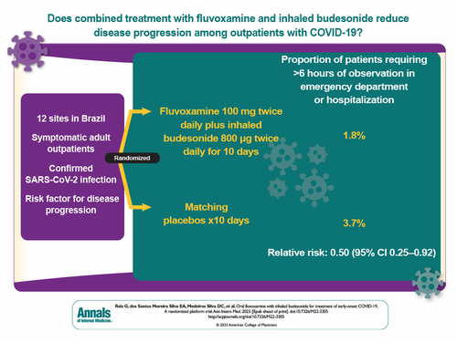 El tratamiento con fluvoxamina oral más budesonida inhalada entre pacientes ambulatorios de alto riesgo con COVID-19 temprano redujo la incidencia de enfermedad grave que requiere atención avanzada. Ann Intern Med, 18 de abril de 2023