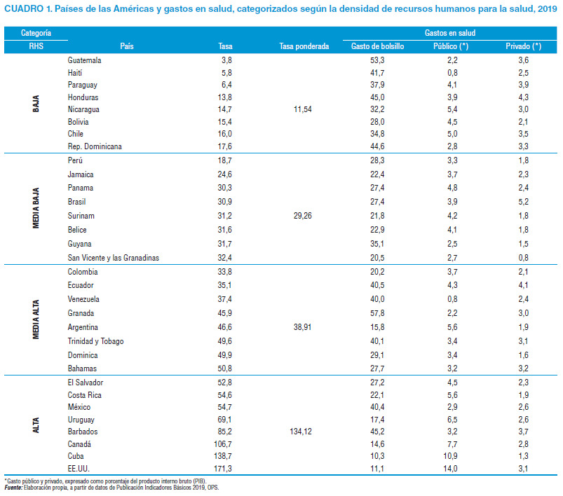 La densidad de recurso humano en salud presenta alta variabilidad entre países y grupos categorizados; se concentra en forma desigual en la población, y es mayor en los países con mayor gasto público. Como estratificador de la muestra permitió evidenciar desigualdades y gradientes de gastos en salud; los estratos de menor densidad presentan mayor gasto de bolsillo, menor gasto público y mayor gasto privado. Rev Panam Salud Publica, 4 de noviembre de2020