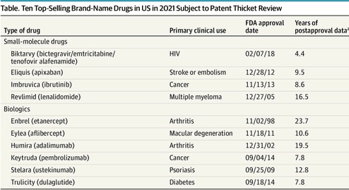 Este estudio encontró que de las 1429 patentes solicitadas para los 10 medicamentos recetados más vendidos en los EE. UU. en 2021, las presentadas después de la aprobación de la FDA (casi las tres cuartas partes) y que contenían reivindicaciones que cubrían aspectos distintos del ingrediente activo del medicamento contribuyeron a la maraña de patentes. Es necesario un examen minucioso de las solicitudes de patentes y de las patentes presentadas después de la aprobación de la FDA para facilitar la competencia oportuna de genéricos o biosimilares. JAMA Intern Med. 13 de mayo de 2024.