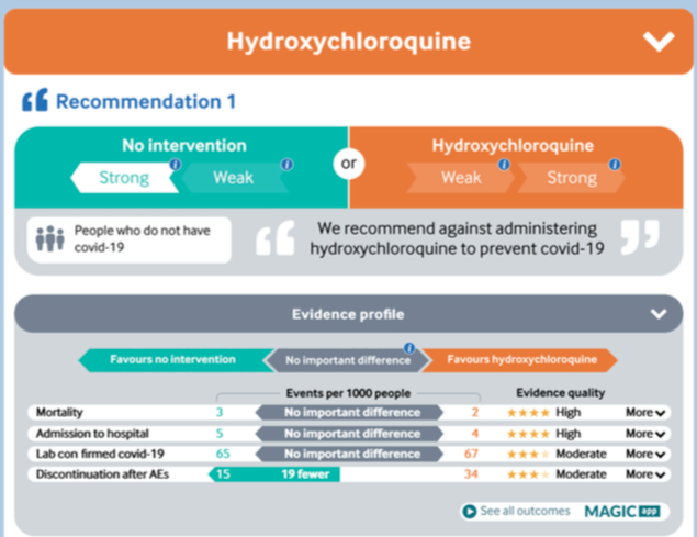 El panel de desarrollo de la guía hizo una recomendación fuerte en contra el uso de hidroxicloroquina para las personas que no tienen covid-19 (certeza alta). BMJ, 2 de marzo 2021