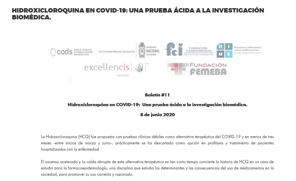 DIME (decisiones informadas sobre medicamentos). Boletín #11 , 8 de junio de 2020. El boletín presenta una cronología de los acontecimientos y de los hallazgos detrás de la investigación clínica de HCQ en COVID-19. La construcción de un modelo independiente y confiable, fundado en principios éticos y científicos sólidos, es el principal reto actual para la comunidad científica global. Posiblemente ningún modelo esté libre de fallas y conflictos, pero hay lecciones a considerar