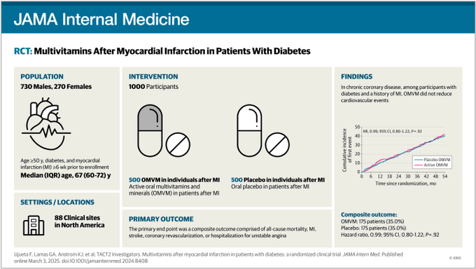 Los resultados de este ensayo clínico aleatorizado demostraron que, para los participantes con enfermedad coronaria crónica, diabetes y un infarto de miocardio previo, la dosis alta de multivitamínicos y multiminerales orales sola o junto con la quelación basada en edetato disódico (EDTA) no redujo los eventos cardiovasculares. JAMA Internal Med 3 de marzo de 2025.