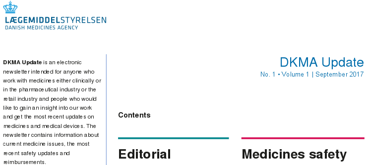 DMA, 11 de septiembre de 2017 El boletín informativo Danish Pharmacovigilance Update,de la Agencia Danesa de Medicamentos, cambia el nombre a DKMA Update y de ahora en adelante contendrá información sobre los medicamentos en general, seguridad de los pacientes y ciencias de la vida, DKMA Update es un boletín electrónico destinado a cualquier persona que trabaje con medicamentos. El boletín continuará centrándose en las actualizaciones de seguridad más recientes, pero también se centrará en otros temas farmacéuticos actuales. En este número, nuestro Director General Thomas Senderovitz presenta su punto de vista sobre el impacto de Brexit en la colaboración farmacéutica europea.