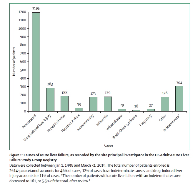 Lancet 7 de septiembre de 2019 a insuficiencia hepática aguda es una consecuencia rara y grave de la lesión abrupta de hepatocitos, y puede evolucionar durante días o semanas hasta un resultado letal. Las causas de insuficiencia hepática aguda incluyen toxicidad de paracetamol, isquemia hepática, hepatitis viral y autoinmune, y daño hepático inducido por medicamentos por medicamentos recetados y suplementos herbales y dietéticos