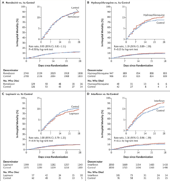 Los regímenes de remdesivir, hidroxicloroquina, lopinavir e interferón tuvieron poco o ningún efecto en los pacientes hospitalizados con Covid-19, según lo indica la mortalidad general, el inicio de la ventilación y la duración de la estancia hospitalaria. N Engl J Med, 3 de diciembre de 2020