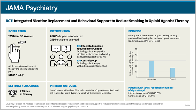 Proporcionar reemplazo integrado de nicotina y apoyo conductual en las clínicas de tratamiento con agonistas opioides ayudó eficazmente a los participantes dependientes de opioides a reducir la cantidad de cigarrillos fumados. JAMA Psychiatry. 12 de febrero de 2025.