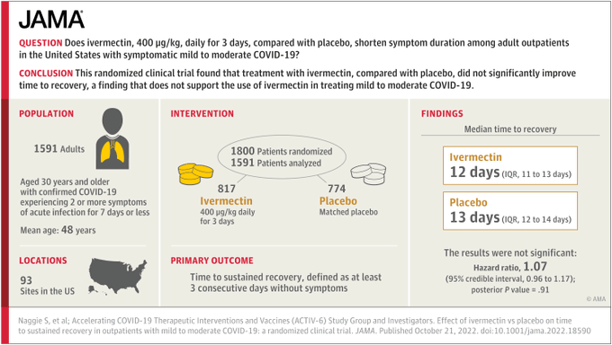 Entre los pacientes ambulatorios con COVID-19 de leve a moderado, el tratamiento con ivermectina, con una dosis máxima objetivo de 600 μg/kg al día durante 6 días, en comparación con el placebo, no mejoró el tiempo de recuperación sostenida. Estos hallazgos no respaldan el uso de ivermectina en pacientes con COVID-19 de leve a moderado. JAMA. 20 de febrero de 2023