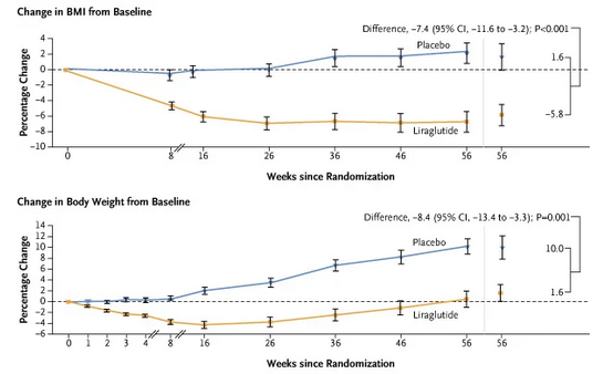 En niños con más de 6 y menos de 12 años de edad con obesidad, el tratamiento con liraglutida durante 56 semanas más intervenciones en el estilo de vida resultó en una mayor reducción del índice de masa corporal que el placebo más intervenciones en el estilo de vida. New England Journal of Medicine, 10 de diciembre de 2024.